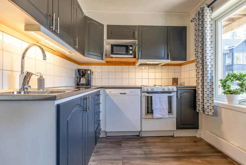 Køkkenet indeholder: elkomfur med ovn, køleskab, frys, microovn, opvaskemaskine.