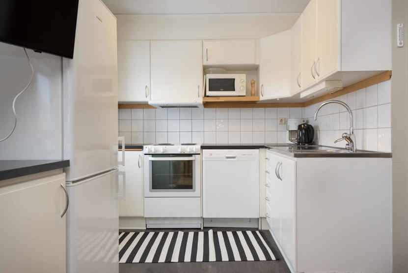 Køkkenet indeholder: elkomfur med ovn, køleskab, frys, microovn, opvaskemaskine.