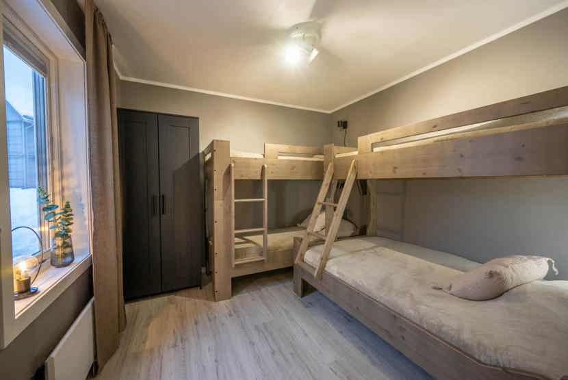 Soveværelse-1= 1 dobbeltseng 180 cm bred. Soveværelse-2= 1 køjeseng, 1 køyeseng med 120 cm bred underkøye og 80 cm bred overkøye. Soveværelse-3= 1 køjeseng, 1 køyeseng med 120 cm bred underkøye og 80 cm bred overkøye.