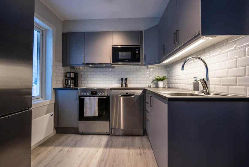 Køkkenet indeholder: elkomfur med ovn, køleskab, frys, microovn, opvaskemaskine.