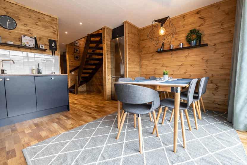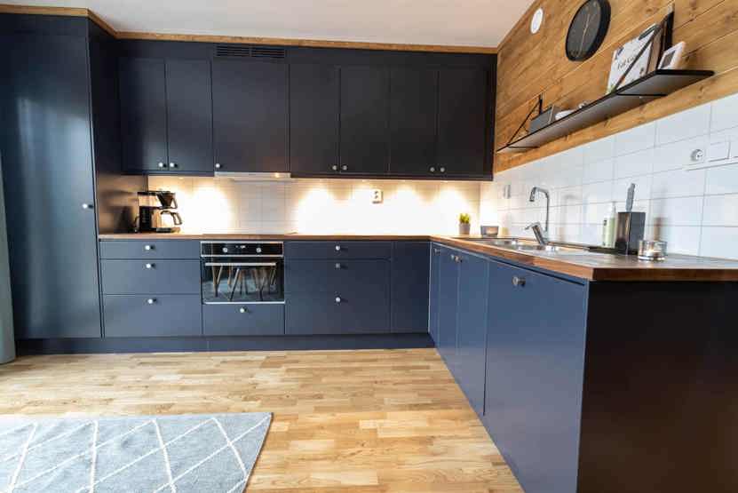 Køkkenet indeholder: Kogeplade med induktion, kombiugn med varmluft og microovn, køleskab, frys, opvaskemaskine.