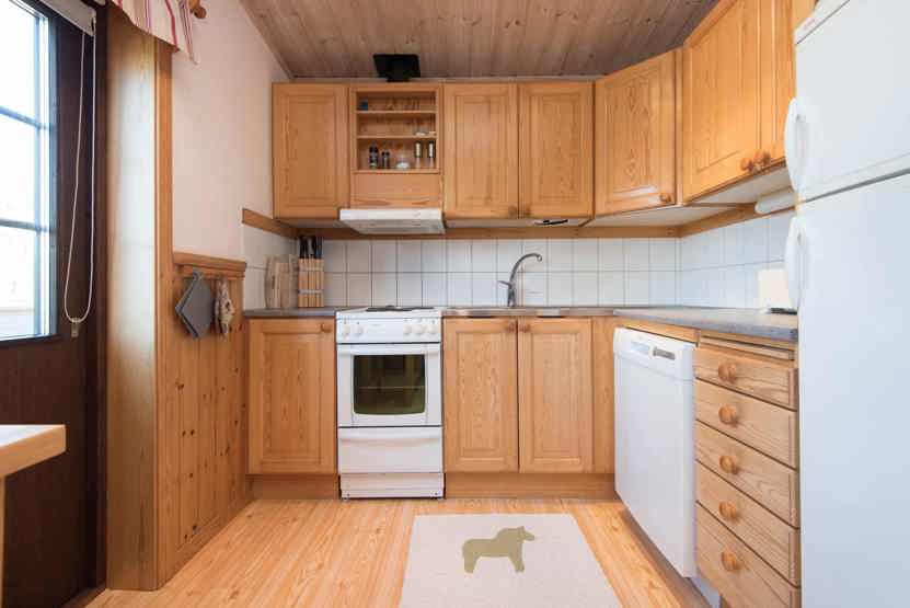 Køkkenet indeholder: elkomfur med ovn, køleskab, opvaskemaskine, frys, microovn.