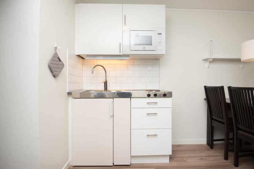 Køkkenet indeholder: trinettekøkken med to plader, køleskab, microovn.