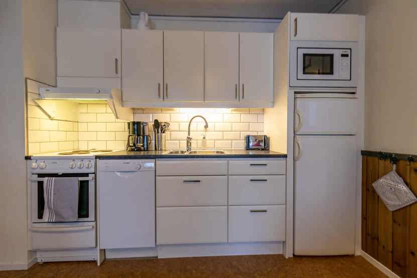 Køkkenet indeholder: Komfur med kun 3 plader, køleskab, frys, opvaskemaskine, microovn.