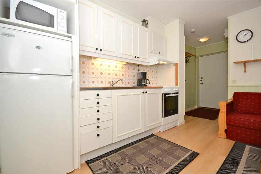 Køkkenet indeholder: elkomfur med ovn, køleskab, frys, microovn.