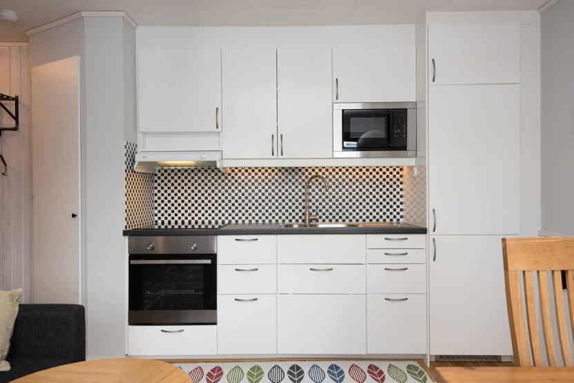 Køkkenet indeholder: elkomfur med ovn, køleskab, frys, microovn.