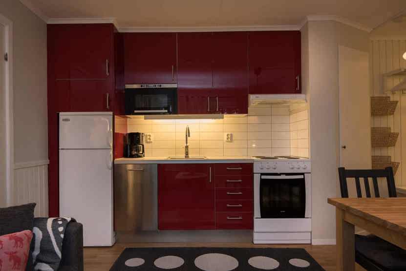 Køkkenet indeholder: elkomfur med ovn, køleskab, frys, opvaskemaskine, microovn.