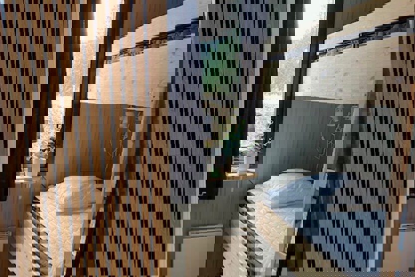 Soveværelse-1= 1 køyeseng med 120 cm bred underkøye og 90 cm bred overkøye, 1 køjeseng hvor både over og underkøje er 90 cm bred.