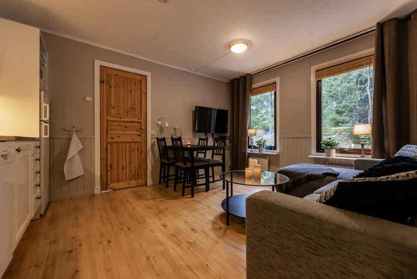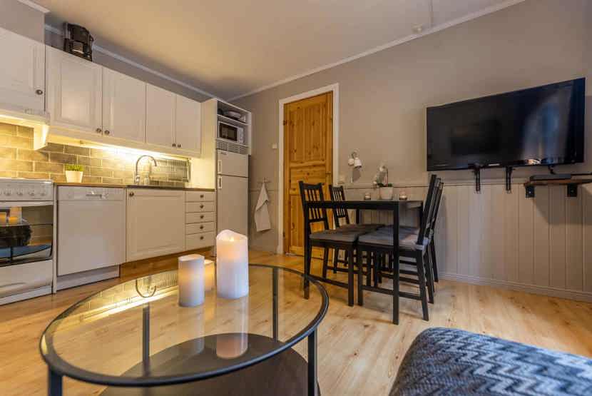 Opholdsstue med køkkenafdeling. TV, tørreskab, adgang til fælles sauna, 8 lejligheder i samme hus, rum til skiudstyr, 1 parkeringsplads, adgang til fælles elbilopladere med type 2 stik mod betaling.