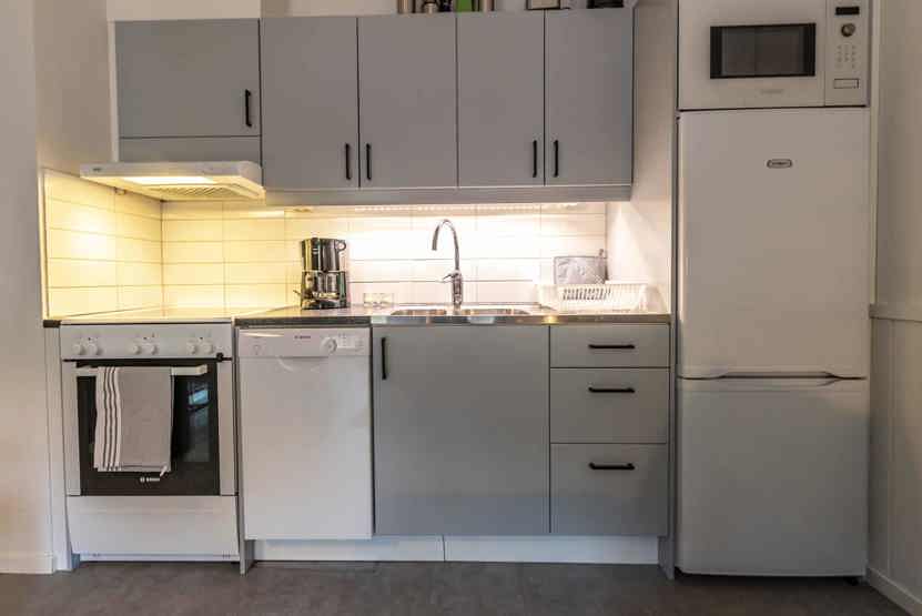 Køkkenet indeholder: keramiske kogeplader med ovn, køleskab, frys, opvaskemaskine, microovn.