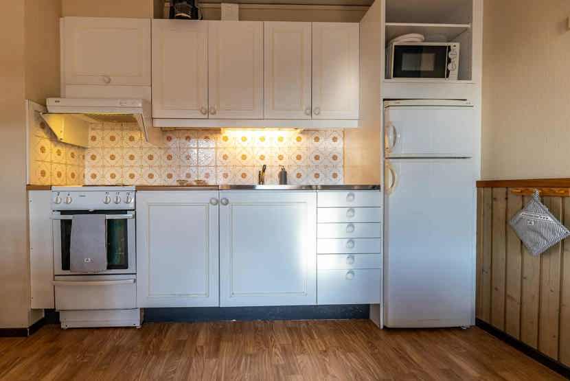 Køkkenet indeholder: Komfur med kun 3 plader, køleskab, frys, microovn.