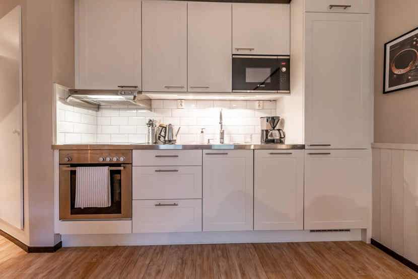 Køkkenet indeholder: keramiske kogeplader med ovn, køleskab, frys, opvaskemaskine, microovn.