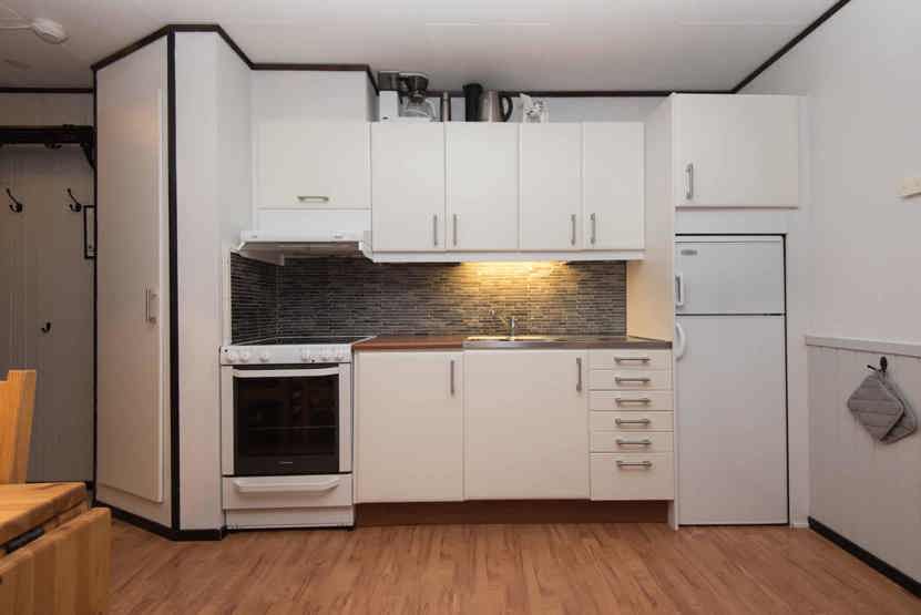 Køkkenet indeholder: elkomfur med ovn, køleskab, frys, microovn.
