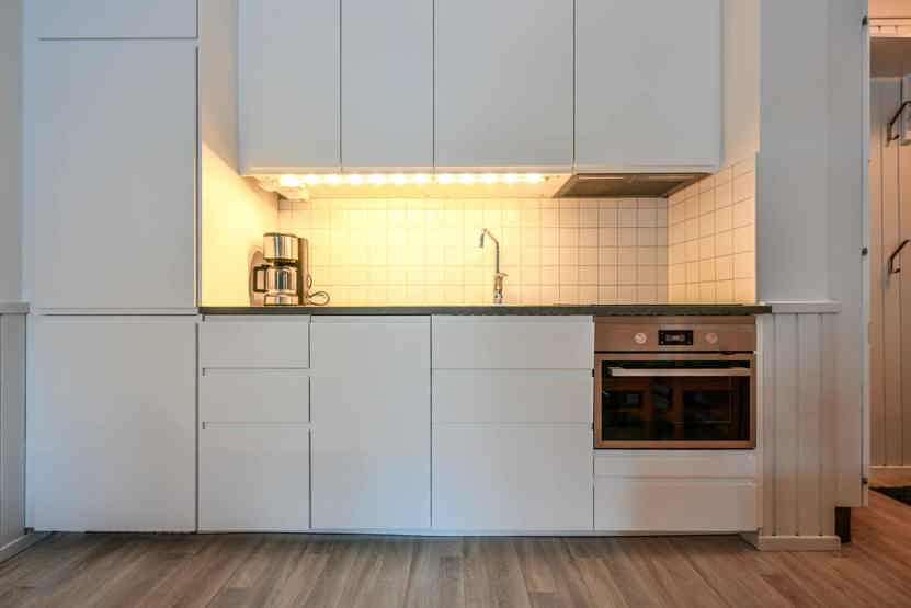 Køkkenet indeholder: elkomfur med ovn, køleskab, frys, opvaskemaskine, microovn.