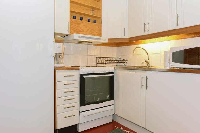 Køkkenet indeholder: elkomfur med ovn, køleskab, frys, microovn.