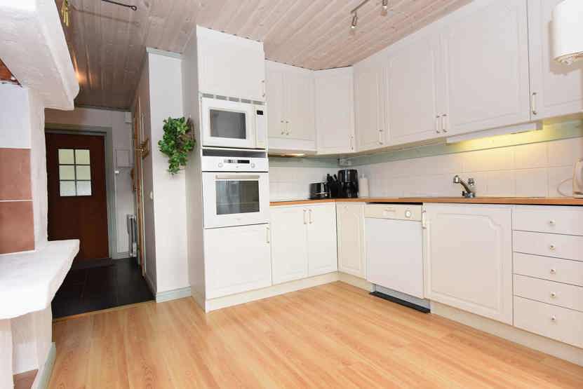 Køkkenet indeholder: elkomfur med ovn, køleskab, frys, opvaskemaskine, microovn.