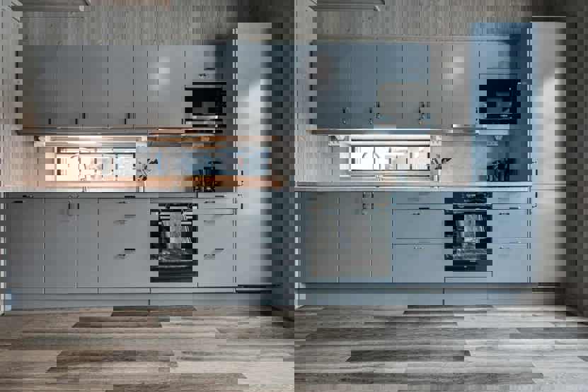 Køkkenet indeholder: elkomfur med ovn, køleskab, frys, opvaskemaskine, microovn.