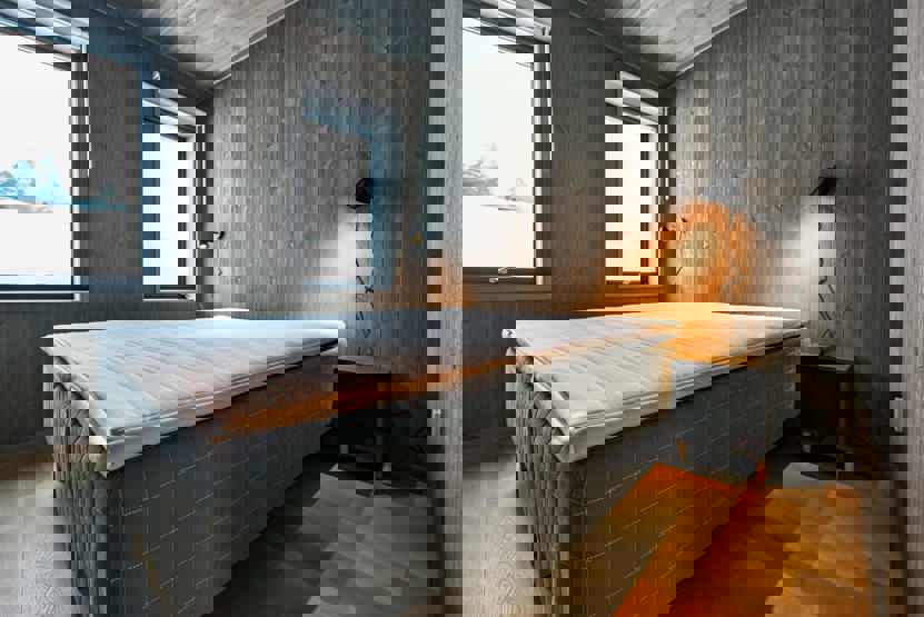 Soveværelse-1= 1 dobbeltseng 160 cm bred. Soveværelse-2= 1 køjeseng hvor både over og underkøje er 90 cm bred.
