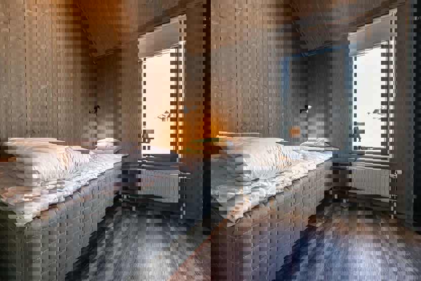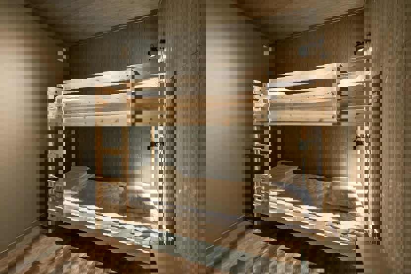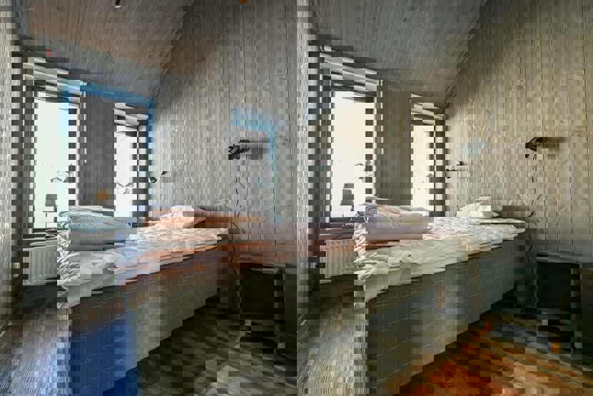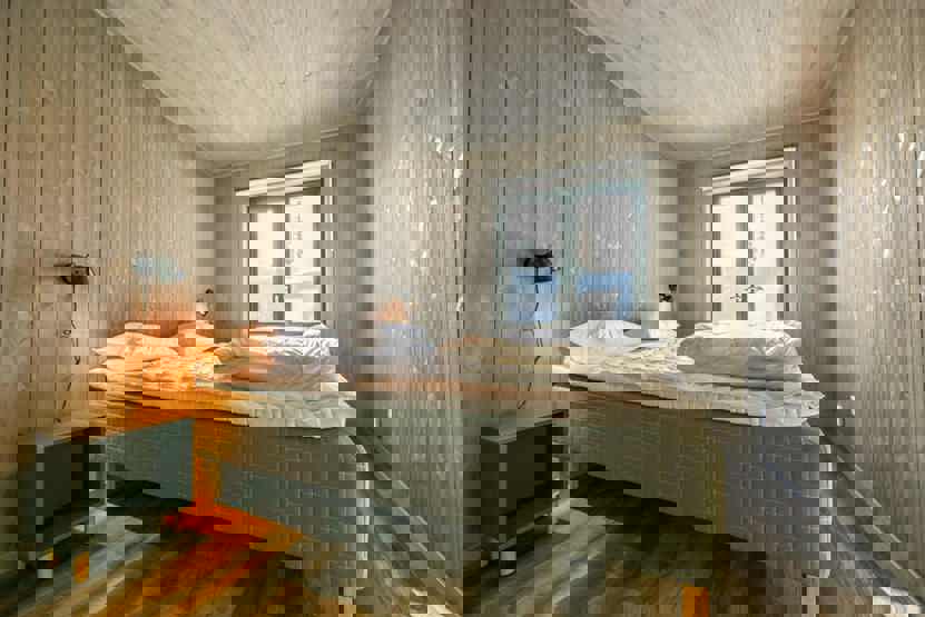Soveværelse-1= 1 dobbeltseng 160 cm bred. Soveværelse-2= 1 enkeltseng 120 cm bred. Soveværelse-3= 1 enkeltseng 90 cm bred. Soveværelse-4= 1 køjeseng hvor både over og underkøje er 90 cm bred. Soveværelse-5= 1 køjeseng hvor både over og underkøje er 90 cm bred, i værelse uden vindue.