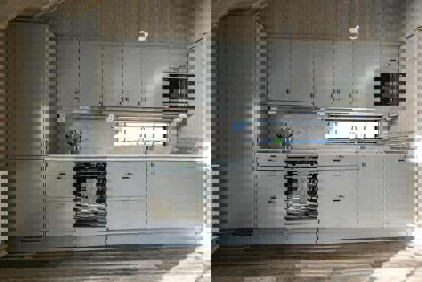 Køkkenet indeholder: elkomfur med ovn, køleskab, frys, opvaskemaskine, microovn.