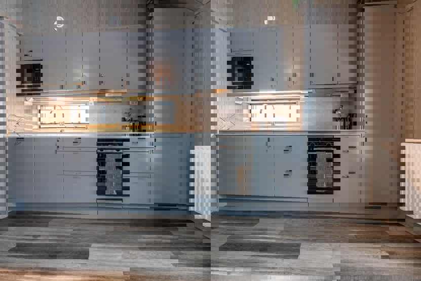 Køkkenet indeholder: elkomfur med ovn, køleskab, frys, opvaskemaskine, microovn.