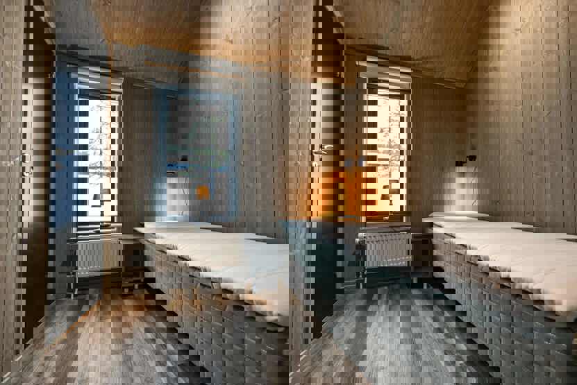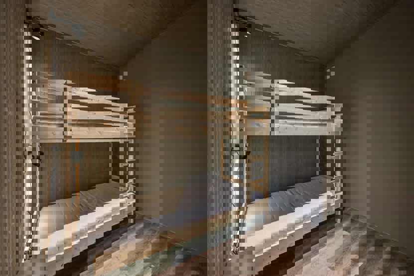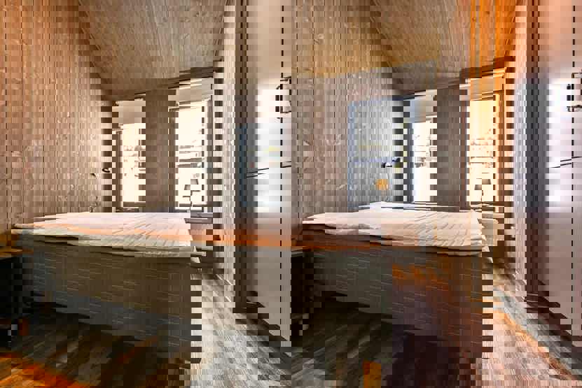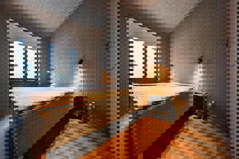 Soveværelse-1= 1 dobbeltseng 160 cm bred. Soveværelse-2= 1 enkeltseng 120 cm bred. Soveværelse-3= 1 enkeltseng 90 cm bred. Soveværelse-4= 1 køjeseng hvor både over og underkøje er 90 cm bred. Soveværelse-5= 1 køjeseng hvor både over og underkøje er 90 cm bred, i værelse uden vindue.