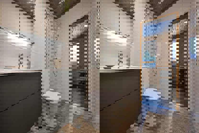 Badeværelset-1 = bruse/wc/sauna. Badeværelset-2 = bruse/wc.