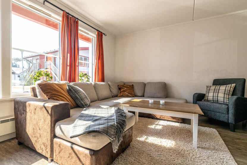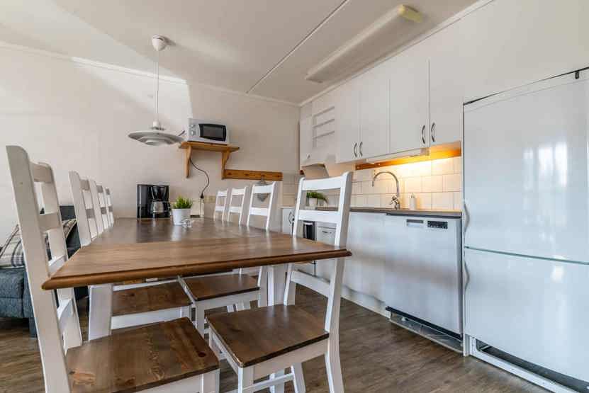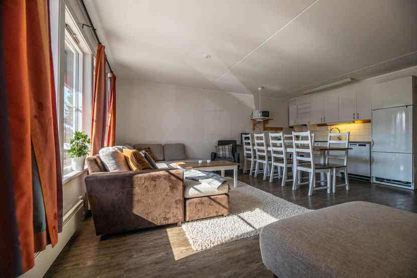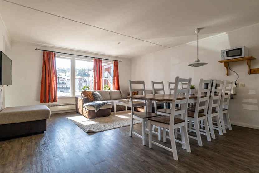 Opholdsstue med køkkenafdeling. TV, tørreskab, rum til skiudstyr, altan (skovles ikke).