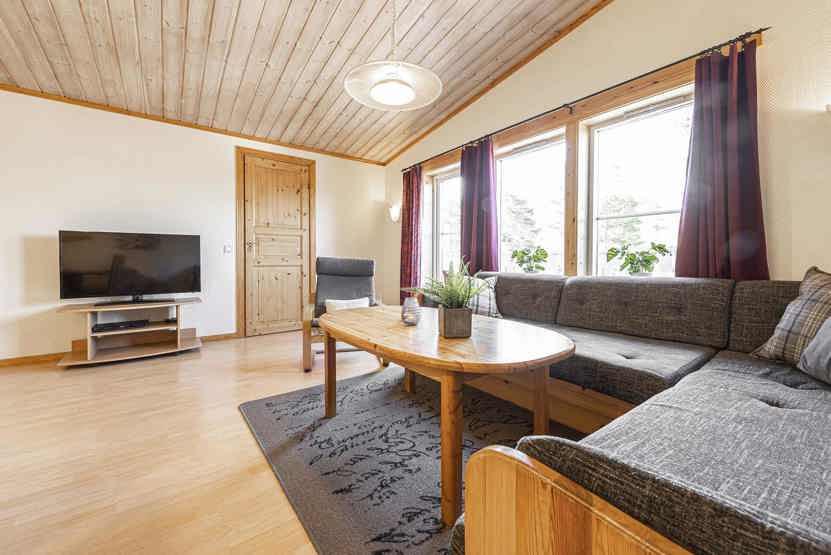 Opholdsstue med køkkenafdeling. TV, tørreskab, rum til skiudstyr, balkon, Væg til væg tæppe i soveværelse.