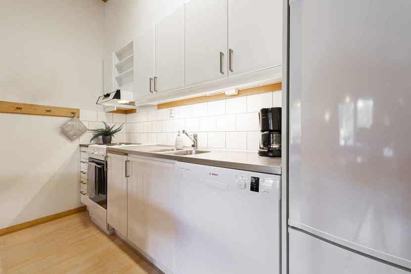Køkkenet indeholder: elkomfur med ovn, køleskab, frys, opvaskemaskine, microovn.