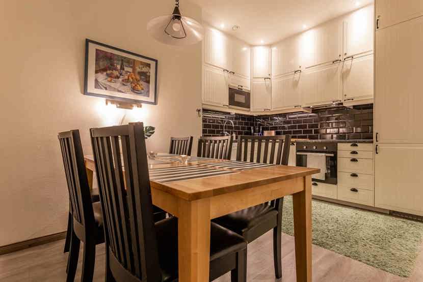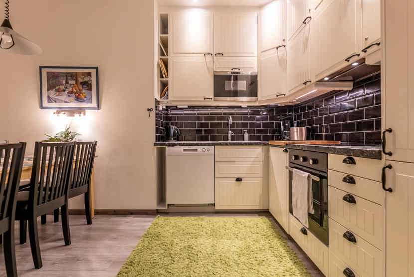 Køkkenet indeholder: elkomfur med ovn, køleskab, frys, opvaskemaskine, microovn.
