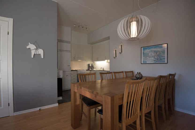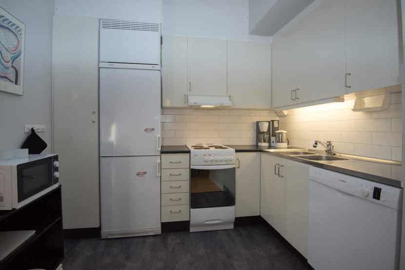 Køkkenet indeholder: elkomfur med ovn, køleskab, frys, microovn, opvaskemaskine.