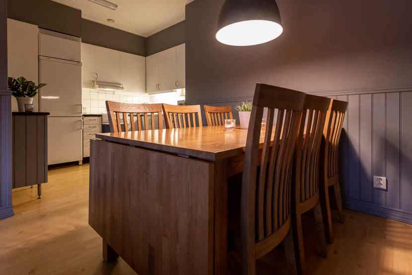 Køkkenet indeholder: elkomfur med ovn, køleskab, frys, opvaskemaskine, microovn.