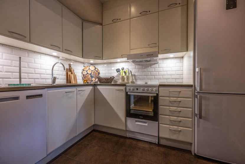 Køkkenet indeholder: elkomfur med ovn, køleskab, frys, microovn, opvaskemaskine.