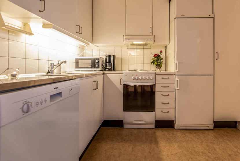 Køkkenet indeholder: elkomfur med ovn, køleskab, frys, microovn, opvaskemaskine.