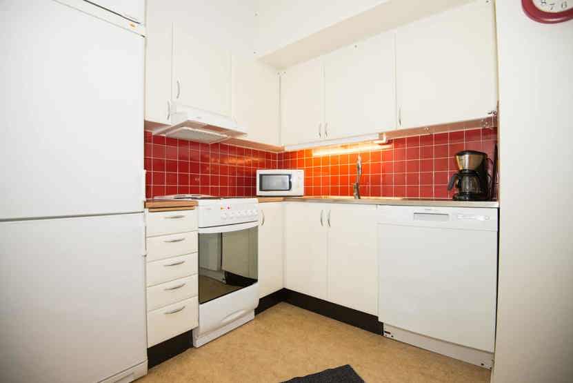 Køkkenet indeholder: elkomfur med ovn, køleskab, frys, microovn, opvaskemaskine.