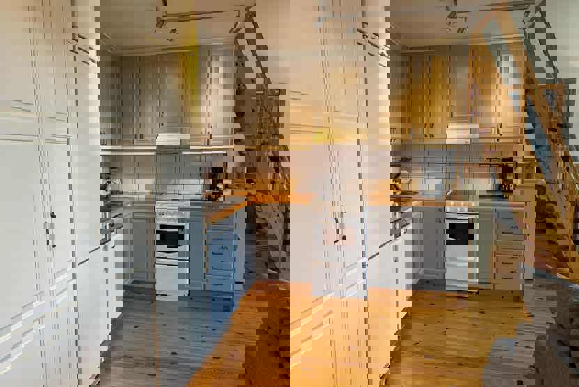 Køkkenet indeholder: elkomfur med ovn, køleskab, frys, opvaskemaskine, microovn.