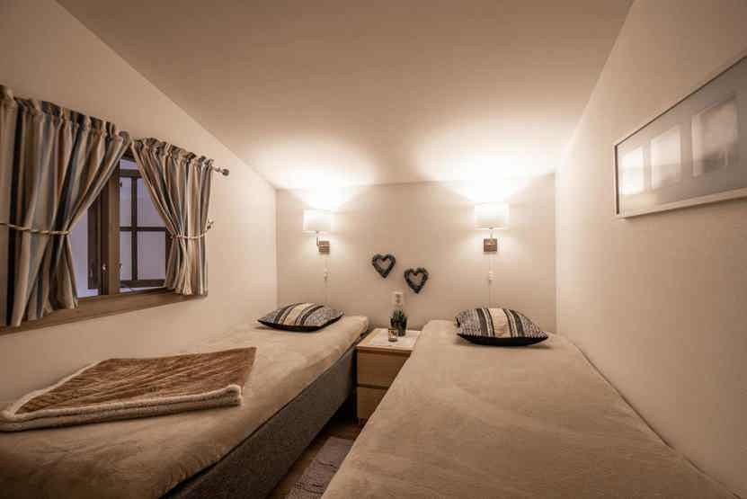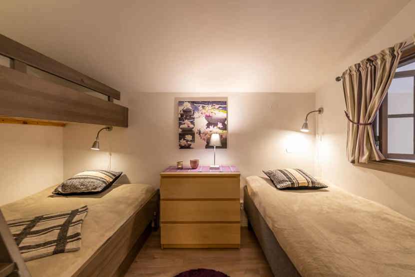 Soveværelse-1= 2 enkeltsenge. Soveværelse-2= 1 køjeseng med 120 cm bred underkøje , 1 enkeltseng.
