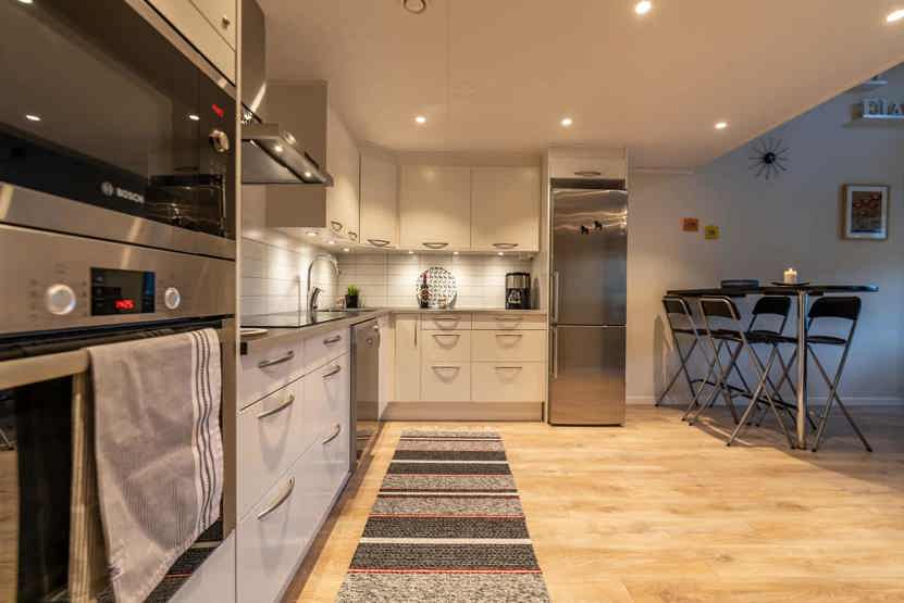Køkkenet indeholder: elkomfur med ovn, køleskab, frys, microovn, opvaskemaskine.