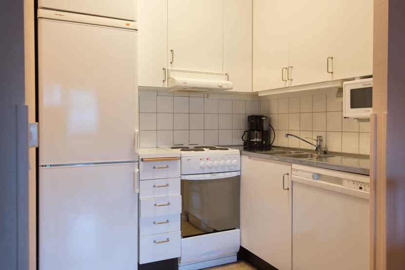 Køkkenet indeholder: elkomfur med ovn, køleskab, frys, opvaskemaskine, microovn.