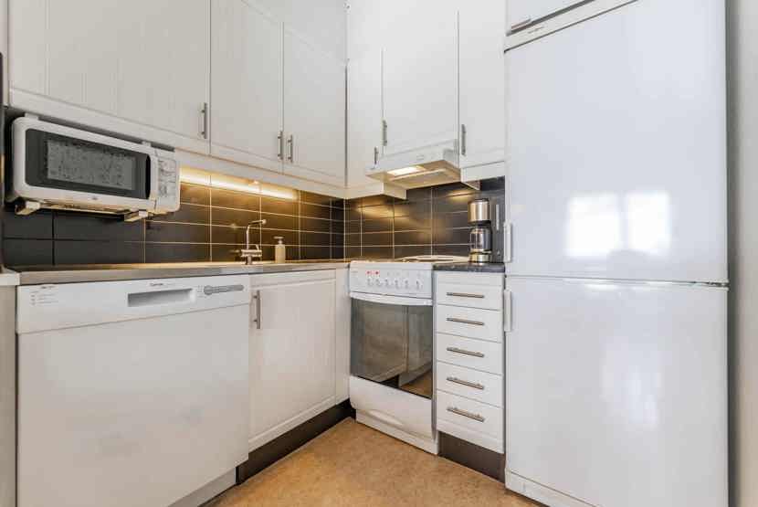 Køkkenet indeholder: elkomfur med ovn, køleskab, frys, opvaskemaskine, microovn.