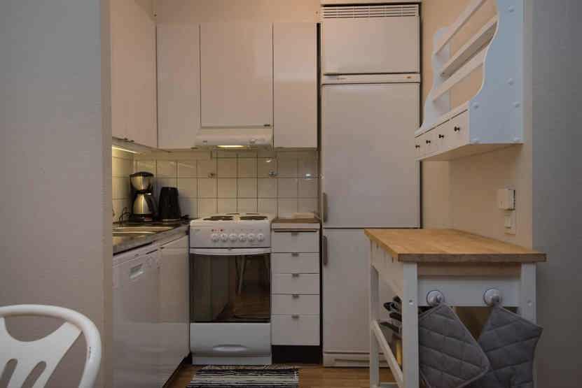 Køkkenet indeholder: kogeplade, ovn, køleskab, frys, opvaskemaskine, microovn.