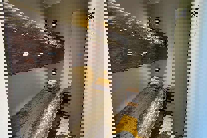 Soveværelse-1= 1 køjeseng med 120 cm bred underkøje . Soveværelse-2= 1 køjeseng, i værelse uden vindue.