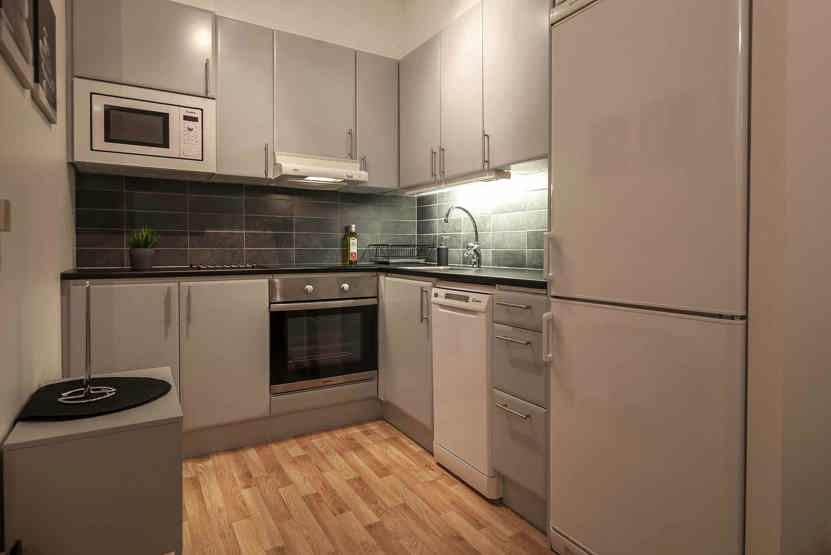 Køkkenet indeholder: elkomfur med ovn, køleskab, frys, opvaskemaskine, microovn.