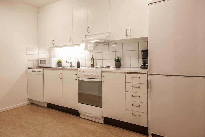 Køkkenet indeholder: elkomfur med ovn, køleskab, frys, opvaskemaskine, microovn.