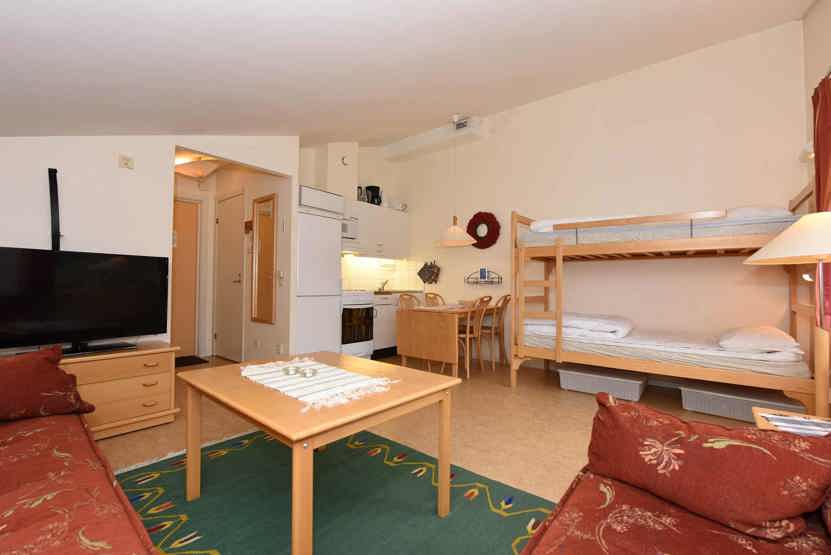 Opholdsstue med kombineret køkken/opholdsstue/soveværelse, sovesofa til 2 personer, 1 køjeseng.