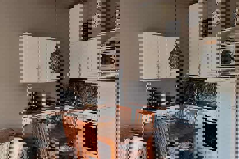 Køkkenet indeholder: elkomfur med ovn, køleskab, frys, opvaskemaskine, microovn.