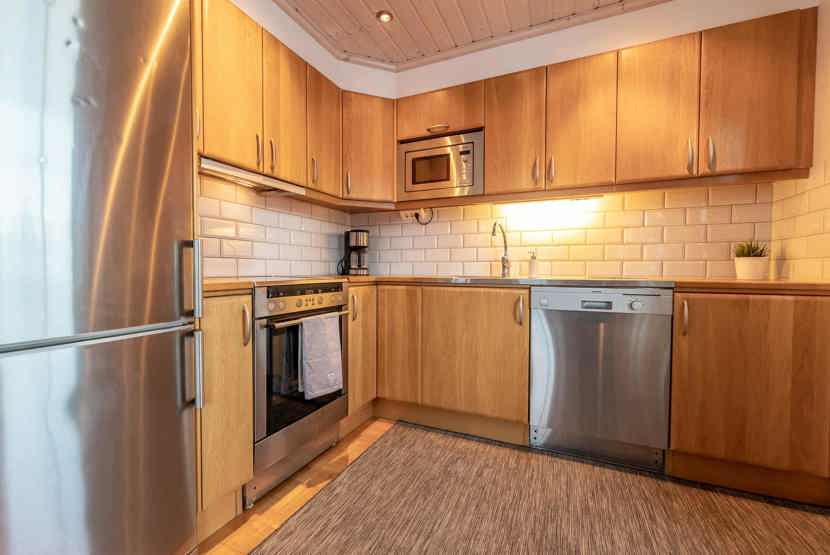 Køkkenet indeholder: kogeplade, ovn, køleskab, frys, opvaskemaskine, microovn.