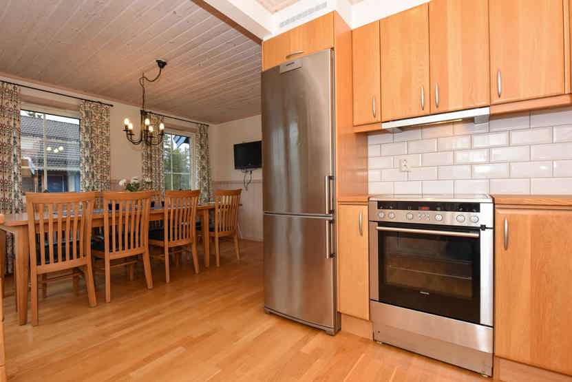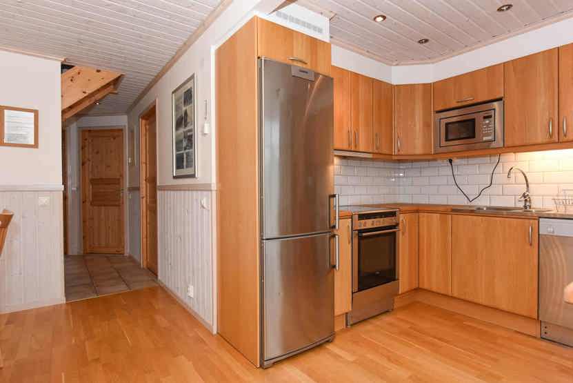 Køkkenet indeholder: kogeplade, ovn, køleskab, frys, opvaskemaskine, microovn.