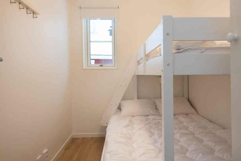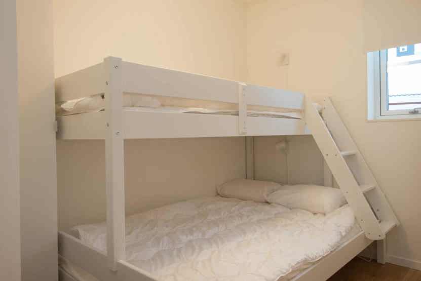 Soveværelse-1= 1 dobbeltseng. Soveværelse-2= 1 køjeseng med 120 cm bred underkøje . Soveværelse-3= 1 køjeseng med 120 cm bred underkøje .